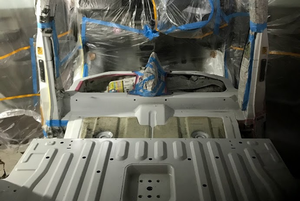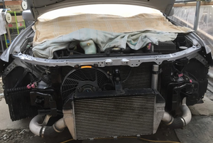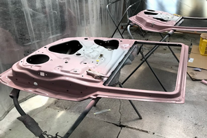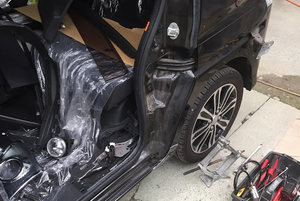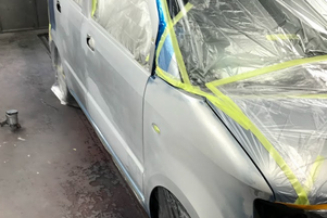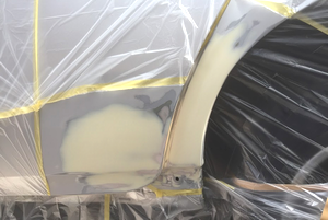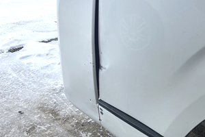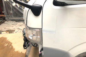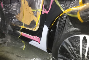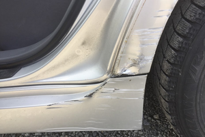 フロント事故による修理です。 フロントバンパー交換、ステップパネル交換、フロントドア修理。 フロントドアが押され6ミリほど入っていましたので、クランプで引き出しています。 フロントドアは伸びきっていましたが、引き出しとシボリを交互に使い分け、交換せずに修理しました。 カラー番号070 3コートパールです。