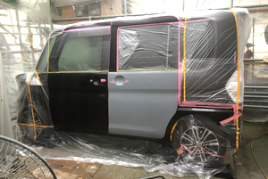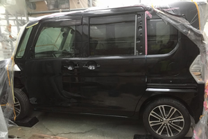 | タントカスタム | スライドドア交換とリヤフェンダー修理。最近多いリヤがスライド式のお車の修理、交換です。きちんと直さないとセンサーが反応し完全な位置まで閉まらなくなりますが、キッチリと直します。